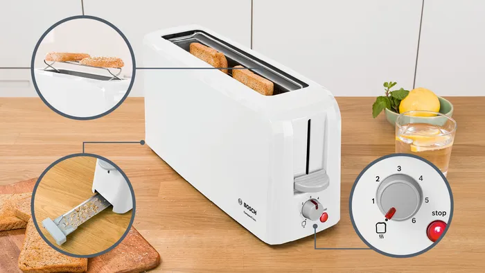 توستر نان مدل TAT3A001 از محصولات کاربردی برند بوش است که امکان برشته و گرم کردن انواع نان را در زمان کوتاه فراهم میکند. این دستگاه با توان ۹۸۰ وات عملکردی قوی دارد و از یک جایگاه وسیع برای قرار دادن دو برش نان کوچک یا یک برش بزرگ بهره میبرد. سیستم برشته کردن آن متمرکز است و نان را به طور یکسان در تمام نقاط گرم میکند. پنل کنترل سادهای برای تنظیم ۶ درجه برشته شدن و روشن/خاموش کردن وجود دارد. در صورت گیر کردن نان، دستگاه به طور اتوماتیک خاموش میشود تا از سوختگی و خطرات جلوگیری کند. بدنه سفیدرنگ از جنس استیل ضدزنگ و مقاوم، ظاهری شیک به آشپزخانه میبخشد. این توستر شامل دسته بالا برنده، سینی خرده نان قابل جداسازی، پایه نگهدارنده برای گرم کردن و دکمههای کاربردی مانند توقف با LED است. استفاده از آن آسان بوده و برای صبحانه سالم یا میانوعده مناسب است.