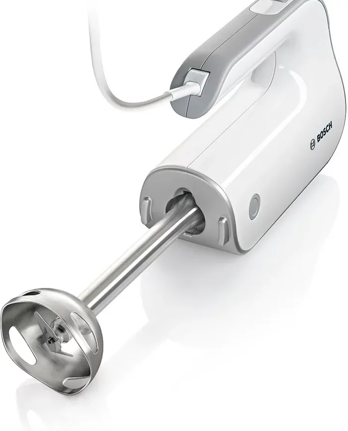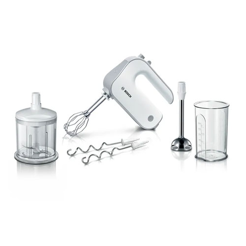 همزن برقی بوش MFQ4080 یک همزن دستی و بدون کاسه می باشد. این همزن دارای کاربرد های مختلف است و عملکرد های متنوعی را نیز از خود ارائه می دهد و کارکرد آن تنها محدود به یک همزن نمی باشد. شما می توانید از این محصول به عنوان خمیر زن، به عنوان مخلوط کن و خردکن، گوشت کوب برقی و آسیاب نیز استفاده کنید. این موضوع سبب شده است بگوییم این همزن برقی یک وسیله ی چند کاره به حساب می آید و حضور آن در هر آشپزخانه می تواند کارساز و بسیار مفید باشد. برند تولید کننده ی این محصول با کیفیت برند معتبر بوش است. که لوازم خانگی بسیار مناسبی را تولید می کند و نیاز به معرفی خاصی ندارد. چون بعد از گذشت سال ها به برندی معتبر و شناخته شده در سطح جهان تبدیل شده است. توان مصرفی این همزن برابر با 500 وات می باشد که این موضوع نشان می دهد تا چه میزان سرعت عملکرد این دستگاه بالا است. اما با این وجود مصرف برق بسیار پایینی دارد و کاملا بهینه محسوب می شود. موتور این محصول نیز از تکنولوژی مدرن پیروی می کند و در عین حال با وجود قدرت بالایی که دارد سبک و کم صدا می باشد. تنظیمات سرعت: اگر بخواهیم به تنظیمات سرعت در این دستگاه اشاره داشته باشیم. باید به اینکه این محصول از ۵ سرعت مختلف پیروی می کند اشاره کنیم. و علاوه بر این دارای عملکرد توربو عملکرد پالس نیز می باشد. و شما می توانید بر اساس میزان مواد غذایی و با توجه به تایمی که دارید و هر یک از سرعت ها را انتخاب کنید. لیوان شفاف: همان طور که گفتیم این همزن عملکرد مخلوط کن نیز دارد. به همین منظور در اقلام همراه آن یک عدد لیوان شفاف وجود دارد که ظرفیت این برابر با 700 میلی لیتر می باشد. که میزان بسیار بالایی است و نشان میدهد که می توانید مقدار بالایی از مواد غذایی در لیوان این محصول مخلوط کنید.