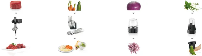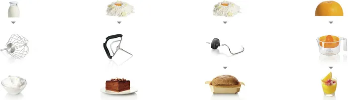 ● لوازم جانبی شامل همزن مفتولی، خمیرزن، همزن با لبه سیلیکونی، رنده و برشدهنده