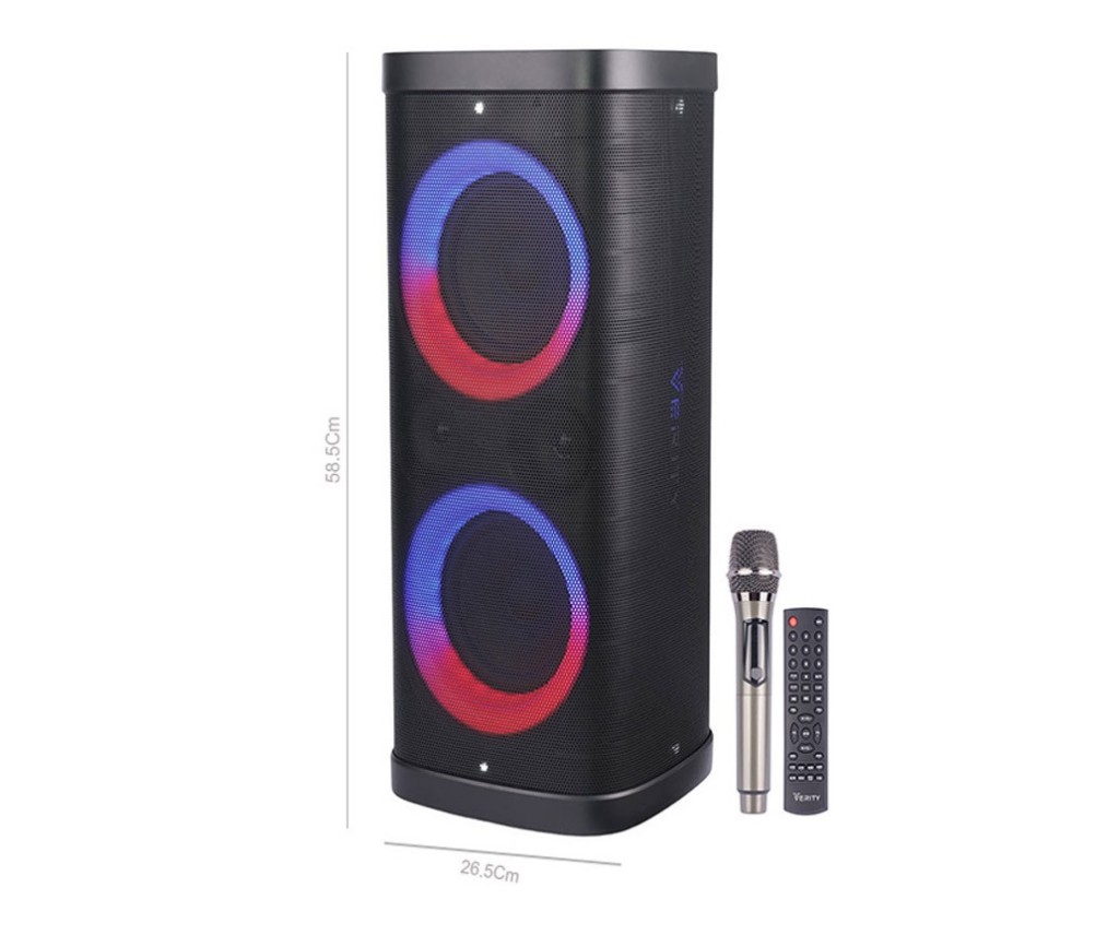 اسپیکر وریتی مدل 2606 نماد یک اسپیکر خاص و کم نظیر با قیمت مناسبه که هم از لحاظ زیبایی منحصر به فرده هم از لحاظ کیفیت ساخت یک اسپیکر خوش رخ با دو عدد ساب ووفر ۶.۵ اینچی یکی بیس بسیار نرم و دقیق با کیفیتی عالی رو به شما ارایه خواهد داد با تیوتر ۲.۵ اینچی که داره باعث میشه از ریز ترین جزئیات صدا هم لذت ببرید پرتاب صدای قابل قبولی داره که شمارو در مهمانی ها و مجالستون همراهی میکنه تازه یک میکروفون وایرلسم داره که باهاش میتونید از خوانندگی لذت ببرید وزنش‌مناسبه و به سادگی میتونید حملش کنید . نورپردازی بسیار زیبایی داره که در کنار اسپیکرم برند VERITY به طور RGB عمل میکند و با فلاشر های ریزی که داره به شدت زیبایی خاصی رو ایجاد میکنه فلاشرها هم rgb هستن