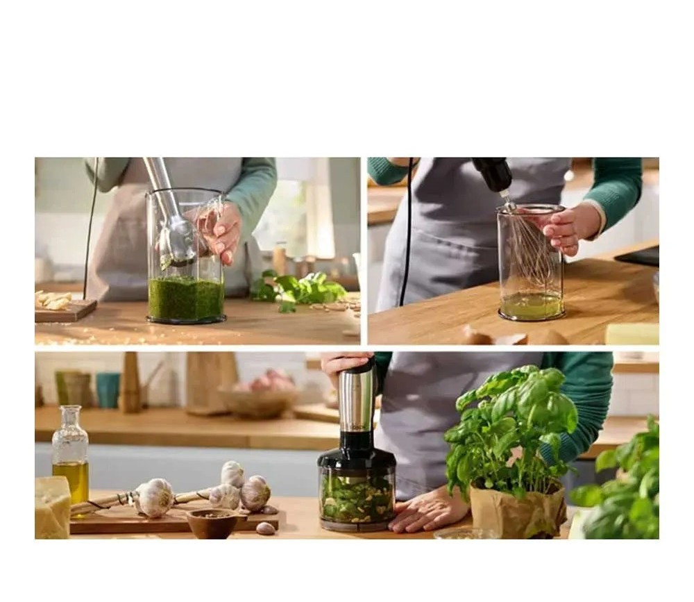 شرکت سازنده یک لیوان پایه بلند شفاف درجه بندی شده با ظرفیت 600 میلی لیتر برای این محصول در نظر گرفته است. با استفاده از پیمانه مخلوط کردن/اندازه گیری می توانید مواد را اندازه بگیرید و مقادیر کم مواد غذایی را مستقیماً در لیوان مخلوط کنید. این لیوان بلند از پاشش مواد غذایی و ریخته شدن آن روی میز و کابینت ها جلوگیری می کند.